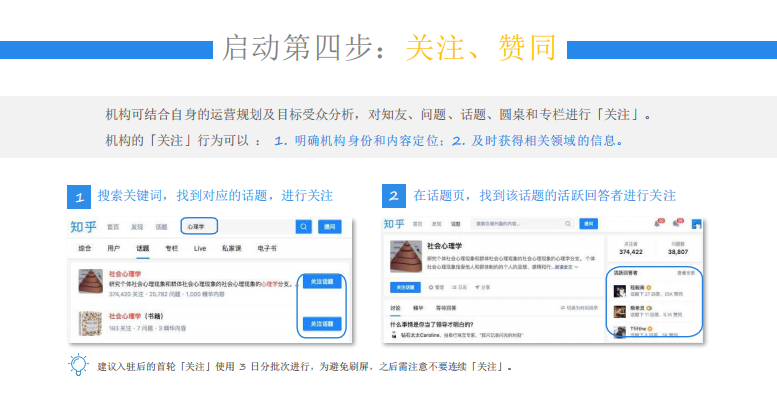 ## 1.运营前,熟悉机构号             ## 2.冷启动的关键 5 步        ## 3.什么内容最受欢迎?  ## 4.如何让更多的人关注我 **优质的内容是获得关注、认同的基石;早期推广、评论互动、选题技巧是获得关注的加速器。** **1.从自有渠道开始,快速积累第一批关注者** **机构号建立初期,累积原始关注很重要,此时可以使用机构已有的渠道快速收获第一批「种子用户」,让他们助力你完成冷启动。** **1****)公司内部**机构号是机构对外展示的一个渠道,当输出和公司产品、服务、活动相关的内容时,可以选择性地将对应的内容转发至公司群,大家一起讨论。 **一方面可以让更多同事关注到机构号,帮助机构号得到更好地展现和传播;另一方面同事也可以从观众的角度提出建议,帮助机构号运营得更好。** **2****)公司媒体矩阵** **i.线上渠道:在机构已有的社交平台、媒体阵营中引导用户,让核心用户在知乎与机构进行更多互动;** **ii.线下渠道:在机构对内、对外的线下宣传渠道中,引导用户关注机构在知乎上的内容输出。** **示例:***AppSo* 将其在知乎的回答「有哪些实用有趣的 *iOS 12* 捷径(*Shortcuts***)规则分享? 」分享到微信公众号上,收获到***3w+*阅读《小白也能看懂的「捷径」指南!》,很好地将知乎和微信公众号进行了互通。 **2.内容尾部** **主动引导知友关注****&**互动原创内容尾部,可使用趣味性、个性化的语言,主动引导知友对你的内容进行赞同、评论,对你的帐号进行关注,来稳定获取你的内容更新动态。例如: **需要特别注意的是****,引导关注&互动时应符合「**知乎社区管理规定**」,不可通过点赞抽奖、集赞更新等形式诱导投票或者诱导关注,如「点赞超过 100 继续更新」等以赞同、关注作为交换的引导为违规行为。如有涉及,知乎小管家将根据情节严重性,对帐号进行不同程度的处理。** **3.每周一个精华回答,持续耕耘** **优质的回答是获得曝光的最佳途径,也是机构号持续耕耘的良好方式。** **随意地寥寥十几个字回答一个问题,回答数增加了一个,但却难以得到认同,时常抖机灵、蜻蜓点水式的回答,反而会降低你在知友心中的好感度、置信度。** **在机构号运营初期,可以多多回答你所在领域的问题,这样将可能获得更多的曝光。** **回答会收获:1)问题的关注者;2)对应话题的关注者;3)机构号的关注者等看到。** **回答的专业程度、实用性是影响着知友关注你机构号的重要因素。500 字以上、信息详实、数据有力、案例生动的回答会激发知友的阅读欲望,必要的配图、清爽的排版,更能提高阅读体验。** **4.与优秀知友「评论」互动,产生连接** **及时回复知友的评论、私信,可以拉近与知友的距离、保持帐号的活跃度。** **除了回复,机构也可主动与同领域优秀的知友建立互动,如:日常关注他们的动态,主动在他们的回答下进行探讨。一方面可以学习他们回答问题的策略和技巧,帮助你更好地运营机构号;另一方面也可与领域内的知友产生更多的连接。** **5.参与高热度问题,为运营加入催化剂** **选题时可以参考问题本身的浏览数、关注数,也可以通过以下 3 种方式快速捕捉高潜力问题。** **1.热榜:热榜汇聚了一定时间内,知友们最关心、讨论最多的问题。机构可选择与自身相关的、还未被充分讨论(各类角度均已有作答)的问题及时回答。如:行业热点、企业相关、盘点「2018 你所在的行业发生了什么大事件?」等。** **2.圆桌:每场圆桌都会邀请有多年行业经验的嘉宾分享他们的探索与洞察。圆桌的问题是针对该主题精心筛选而得的。回答圆桌的问题,优质的回答将可能被圆桌收录,机构可成为该场圆桌的热门回答者,吸引知友的关注。** **3.同领域优秀回答者:通过关注同领域的优秀回答者,可以快速了解领域内的新动向、热议问题。** ## 5.常见得 9 个误区 **误区一:部分人对于运营的理解:“运营不就是个写文案的吗,随便写个文案就行了,就是个打杂的!"** **我可以很实实在在地告诉你,这个理解绝对是错误的,新媒体运营确确实实是有写文案这个部分,但并没有囊括一切。** **误区二:运营是随便找个人都可以做的工作** **一个好的运营,是会具备运营的气质的。比如:做事严谨、接地气、着重细节、忍耐性强、执行力强、思维敏捷等等,这些都是一个优秀运者必须该有的素质。** **误区三:运营就是一个背黑锅的** **运营做的工作有很多,但是很多内容都是没办法拿数据来考核的。其实很多工作都是功过赏罚的,因此最好达成共识。如果确实无法界定归属,那就应是相关人等一起承担。** **误区四:运营就是扛 kpi 的、背数据的** **这点需要你的公司是否足够重视运营,还有这个项目产品驱动的成分有多少,另外也看你个人的能力和担当。** **误区五:运营可以适当吐槽、抱怨** **在各种条件不好的情况下,还能做出优秀的运营作品来,这应该是作为一个优秀运营所坚持的一个原则。** **运营可以抱怨、吐槽么?关键是你抱怨也没用啊,属于你的活还不得照样完成。要么忍,要么滚。而且抱怨、吐槽这些消极情绪影响你所在团队的激情和团结,这种人能力再强,都不可留。** **误区六:你看到的“量”不是“量”** **有的人把上市套现做为目标,有的人却想真正服务于用户,这就是假老板和真老板的区别。** **误区七:运营有方法论** **运营是需要灵活运用的,固定的#思维# 已经很可怕